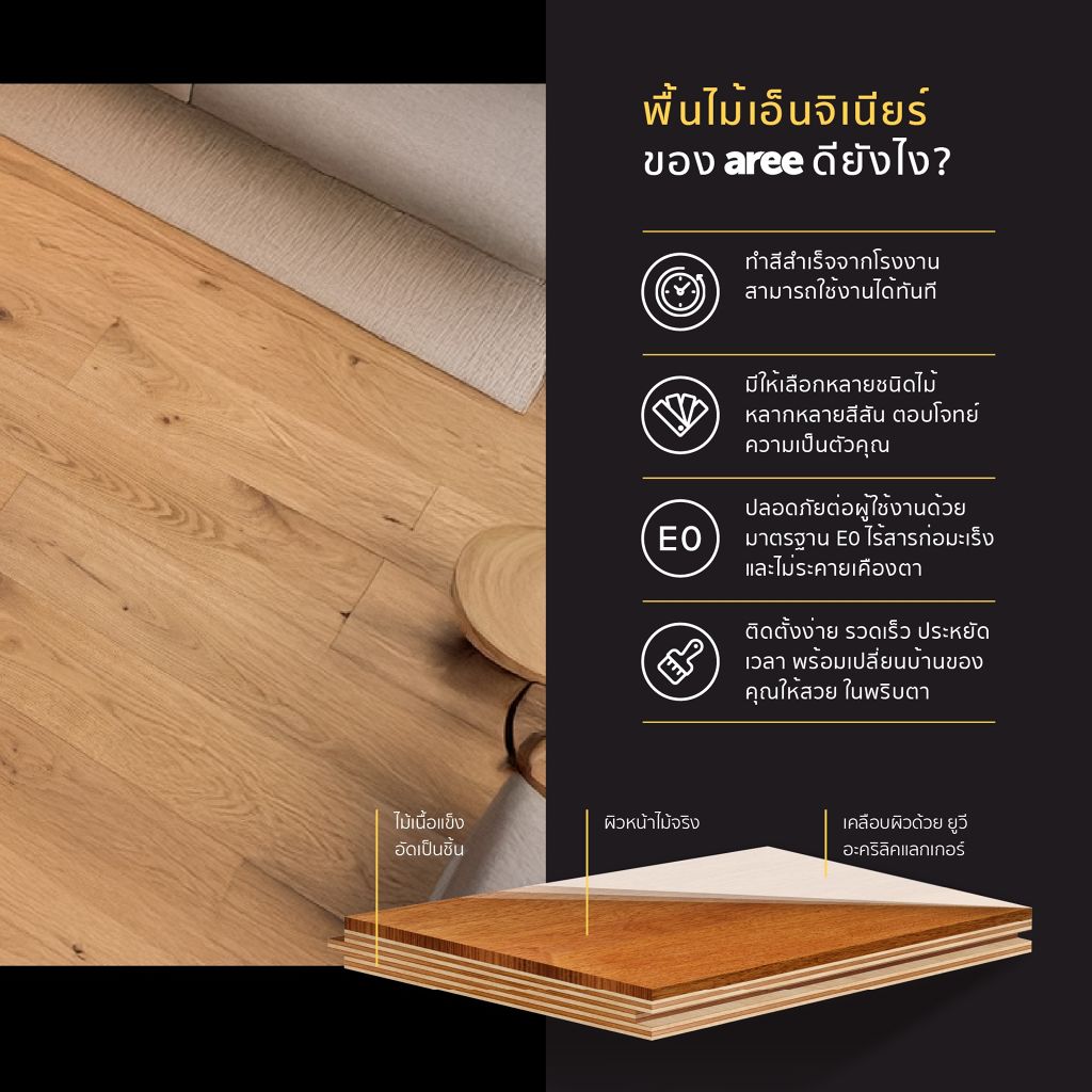 aree มุ่งมั่นผลิตผลิตภัณฑ์ไม้จริงคุณภาพสูง โดยเฉพาะ พื้นไม้เอ็นจิเนียร์ ด้วยเทคโนโลยีขั้นสูงที่ผสมผสานความทนทานของไม้จริงเข้ากับความแข็งแรงของไม้อัด ทำให้ได้พื้นไม้ที่คงทนต่อสภาพอากาศและยังคงความสวยงามจากธรรมชาติ