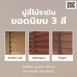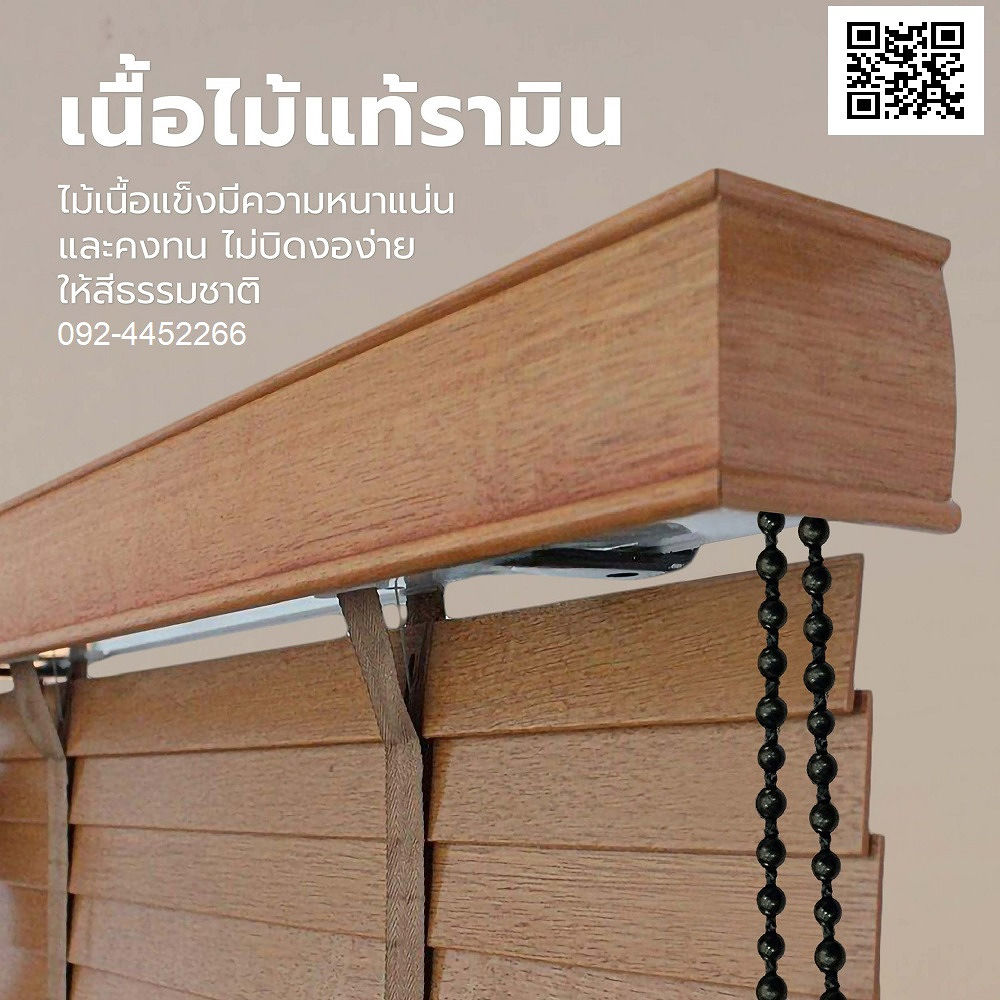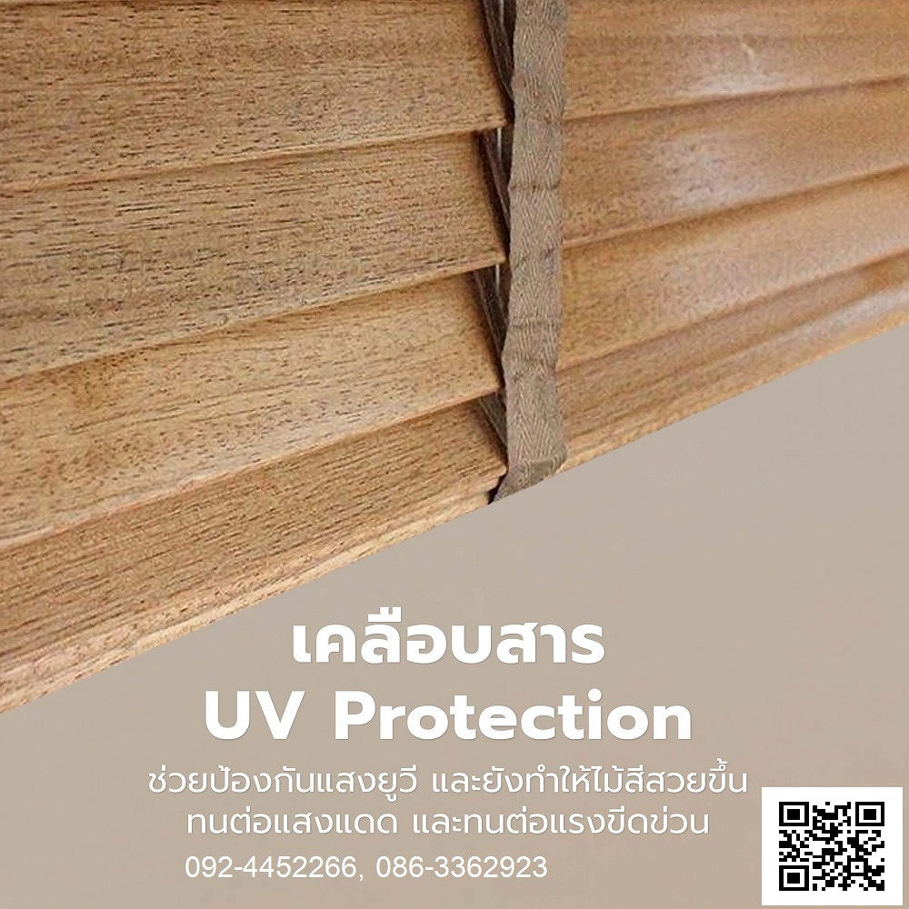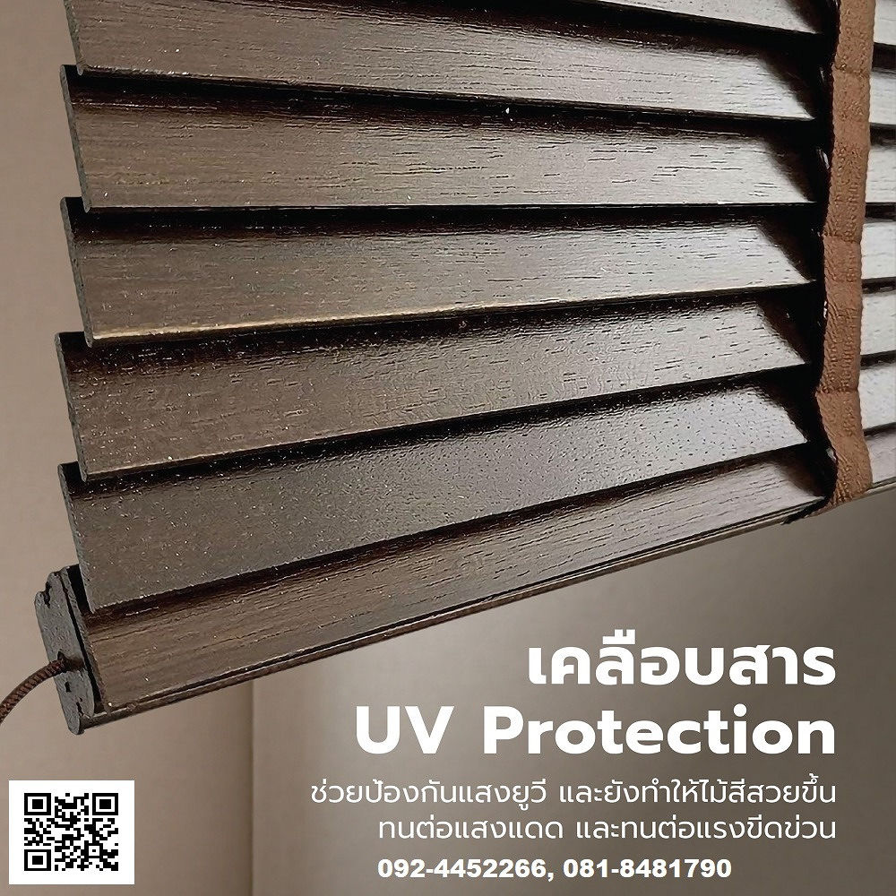 - มู่ลี่ไม้รามินเป็นไม้เนื้อแข็ง ผิวไม้เรียบเนียน นำมาผ่านขั้นตอนการอบและทำสี พร้อมทั้งเคลือบสาร UV Protection เพื่อช่วยให้สีสวยและติดทนมากยิ่งขึ้น